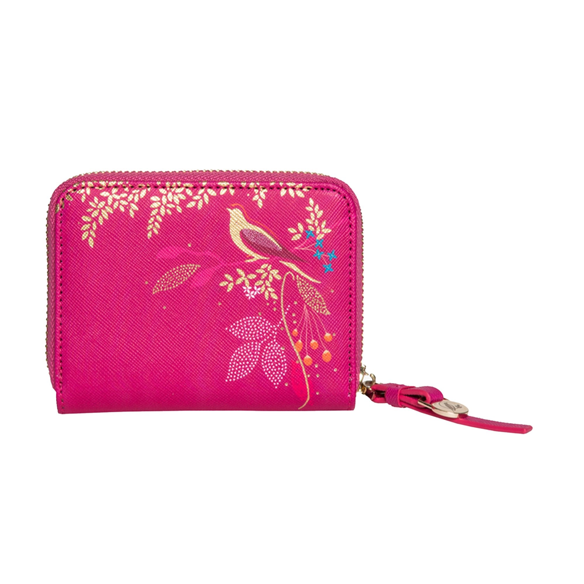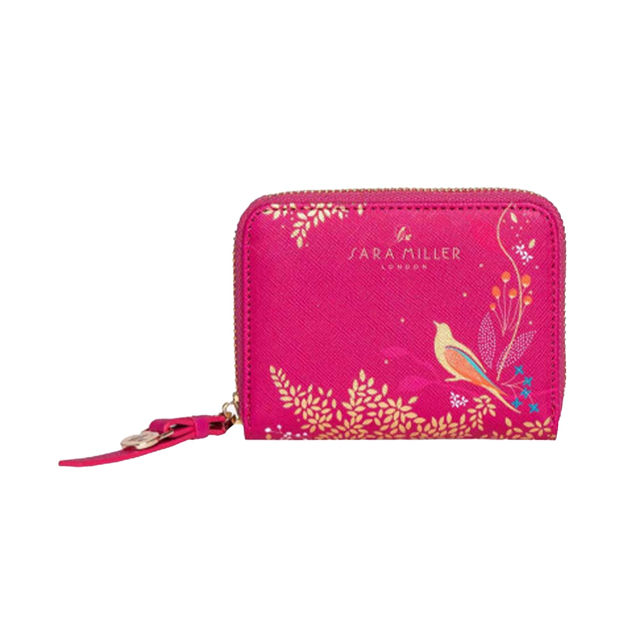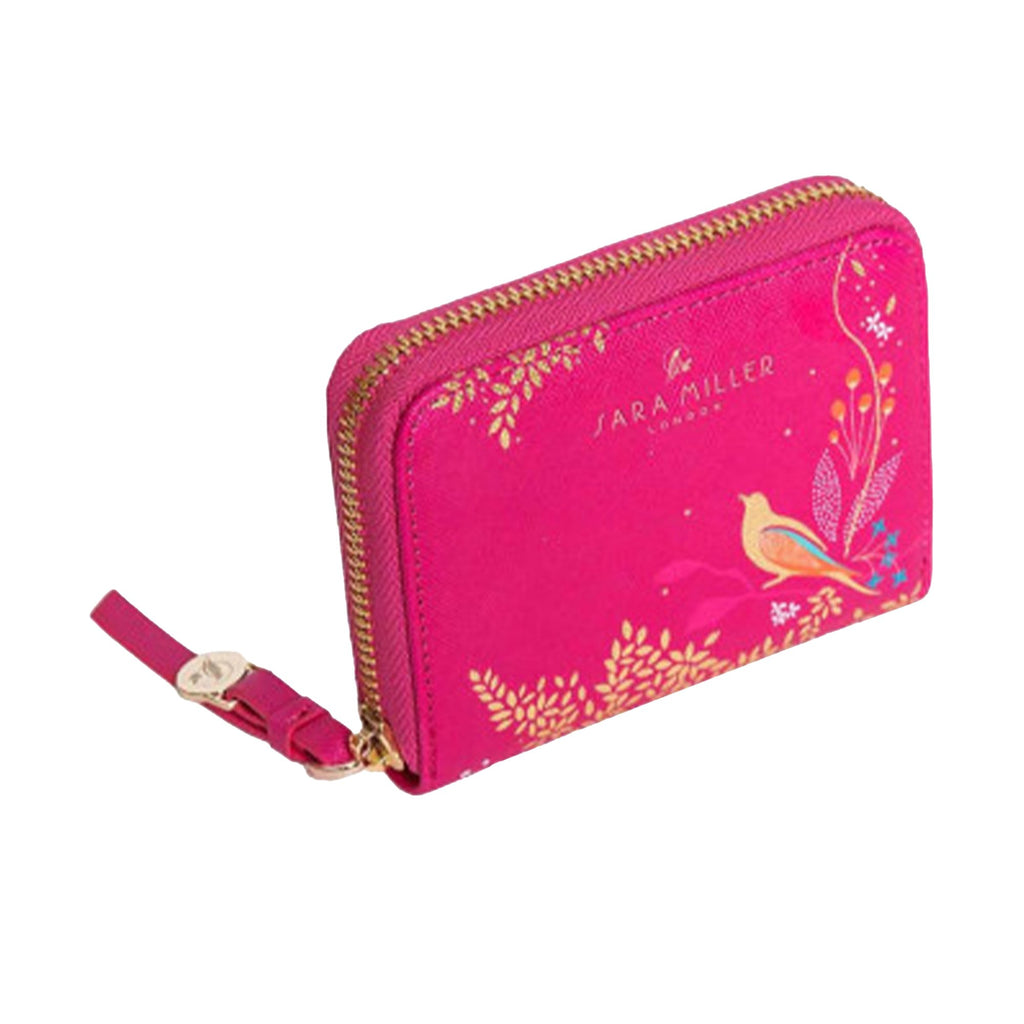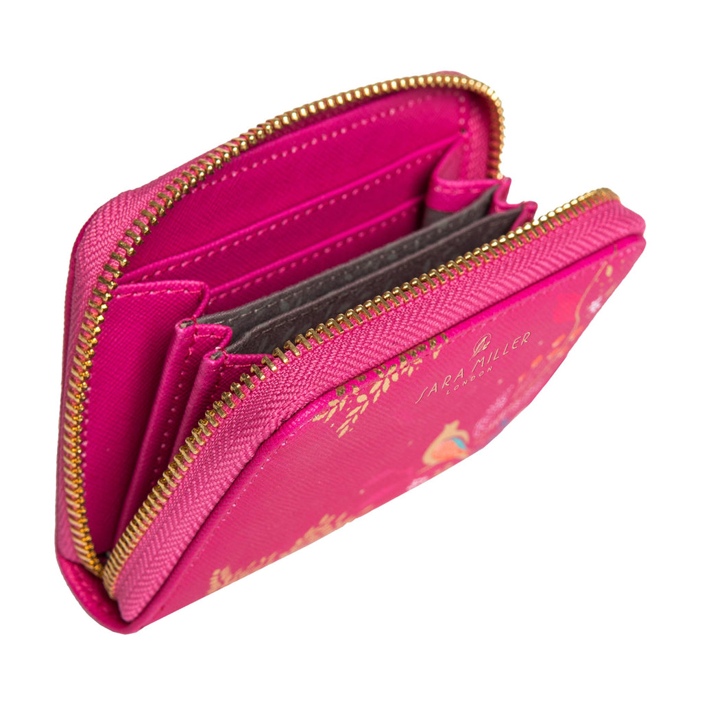 This elegant purse features exotic birds perched within glistening gold foliage. It is ideal for everyday use, with room for both cards and cash essentials, and perfect for popping into smaller handbags. The design features a vibrant enchanted garden print with the added luxury of decorative gold foil details. Zip opening embellished with a delicate gold logo, etched Sara Miller London zip pulls and gold studs, the intricate gold detailing is beautifully set against the durable yet luxurious saffiano embossed fabric. The design is paired with a subtle two-tone grey leaf print lining complimenting the elegant, decorative outer design.