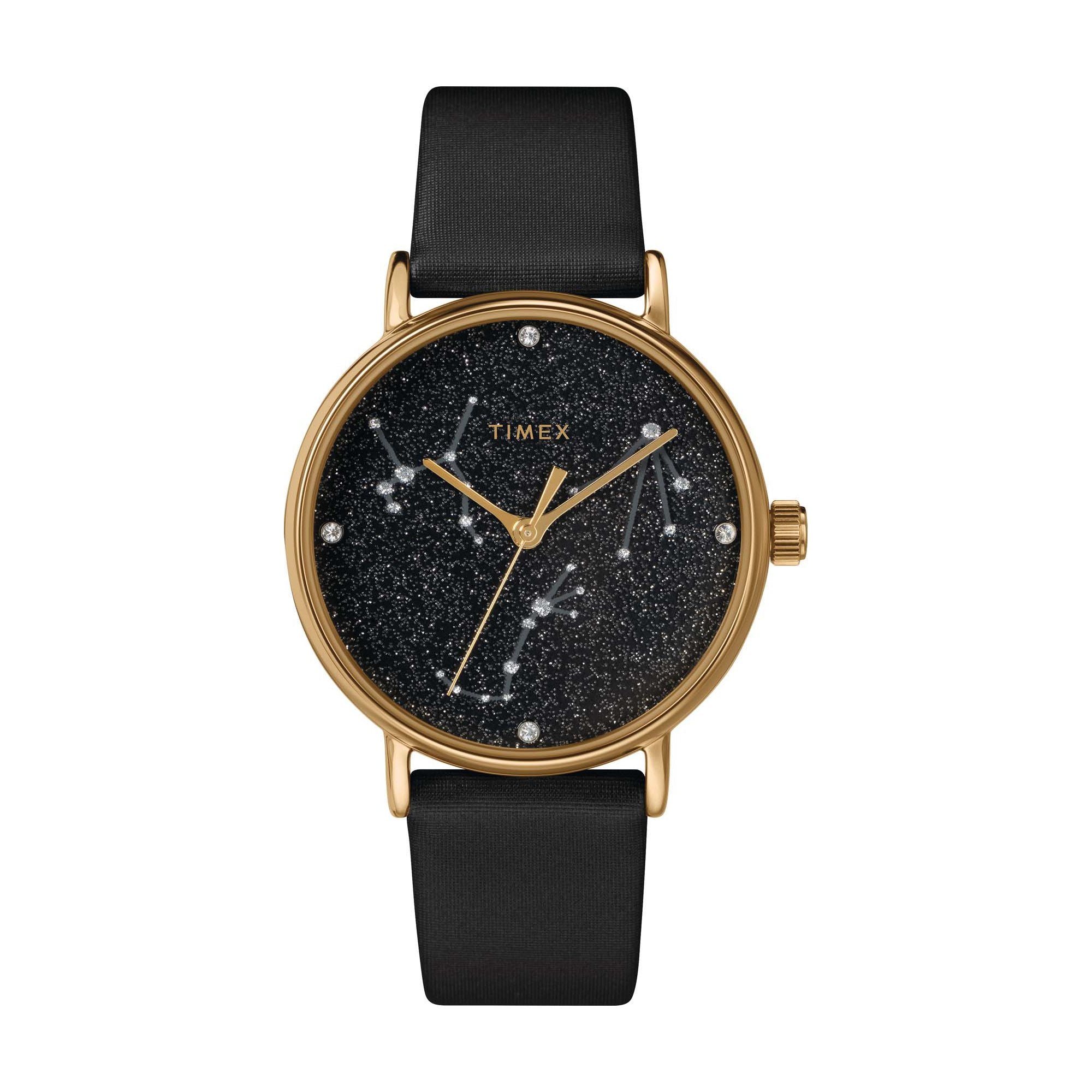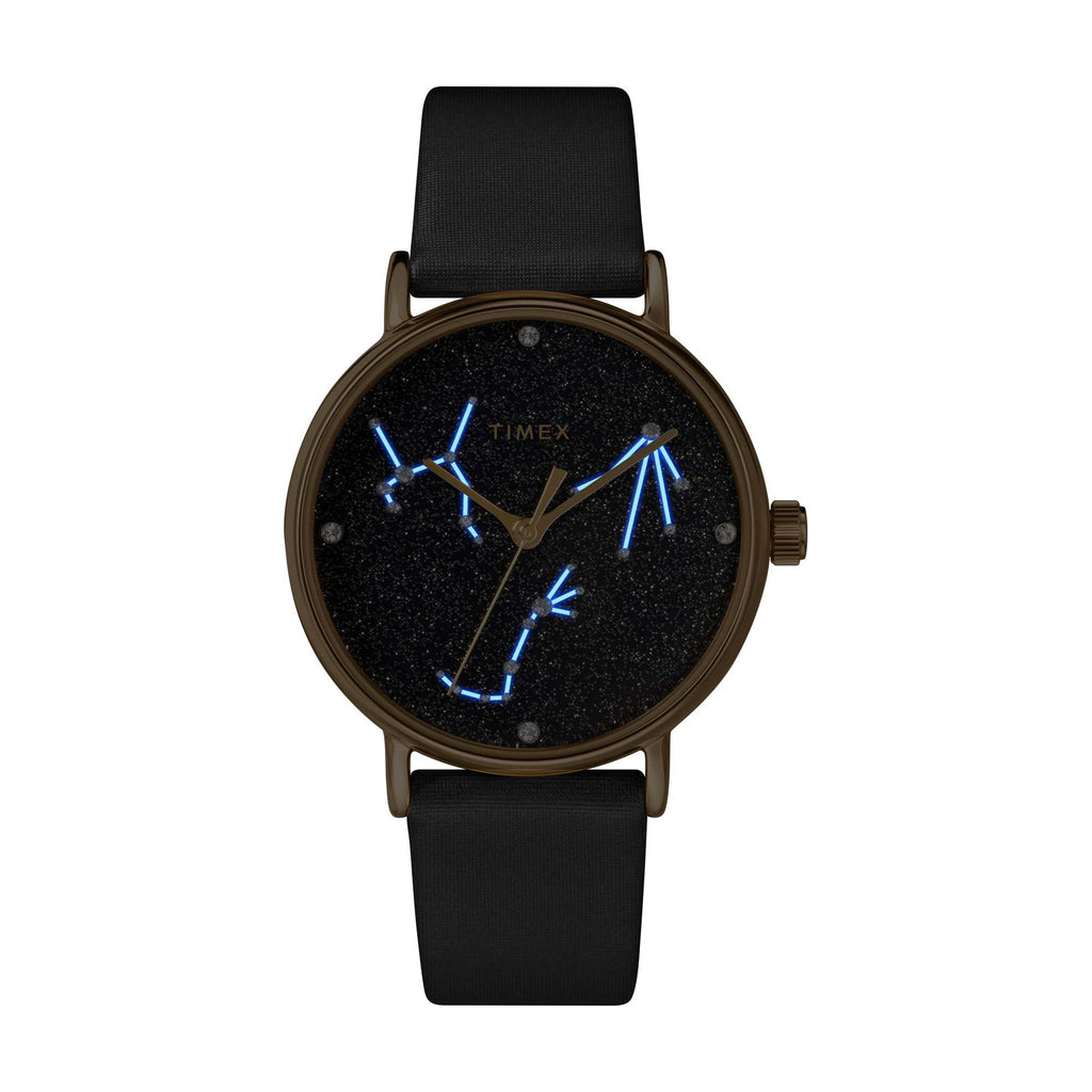 What’s your sign? Keeping the gold-tone case and black textured strap simple, we allowed the ethereal dial featuring the celestial Libra, Scorpio and Sagittarius signs of the zodiac to shine alongside the shimmering Swarovski® crystal accents. When lit up, our INDIGLO® backlight illuminates the constellations, letting you see the stars in a whole new light.