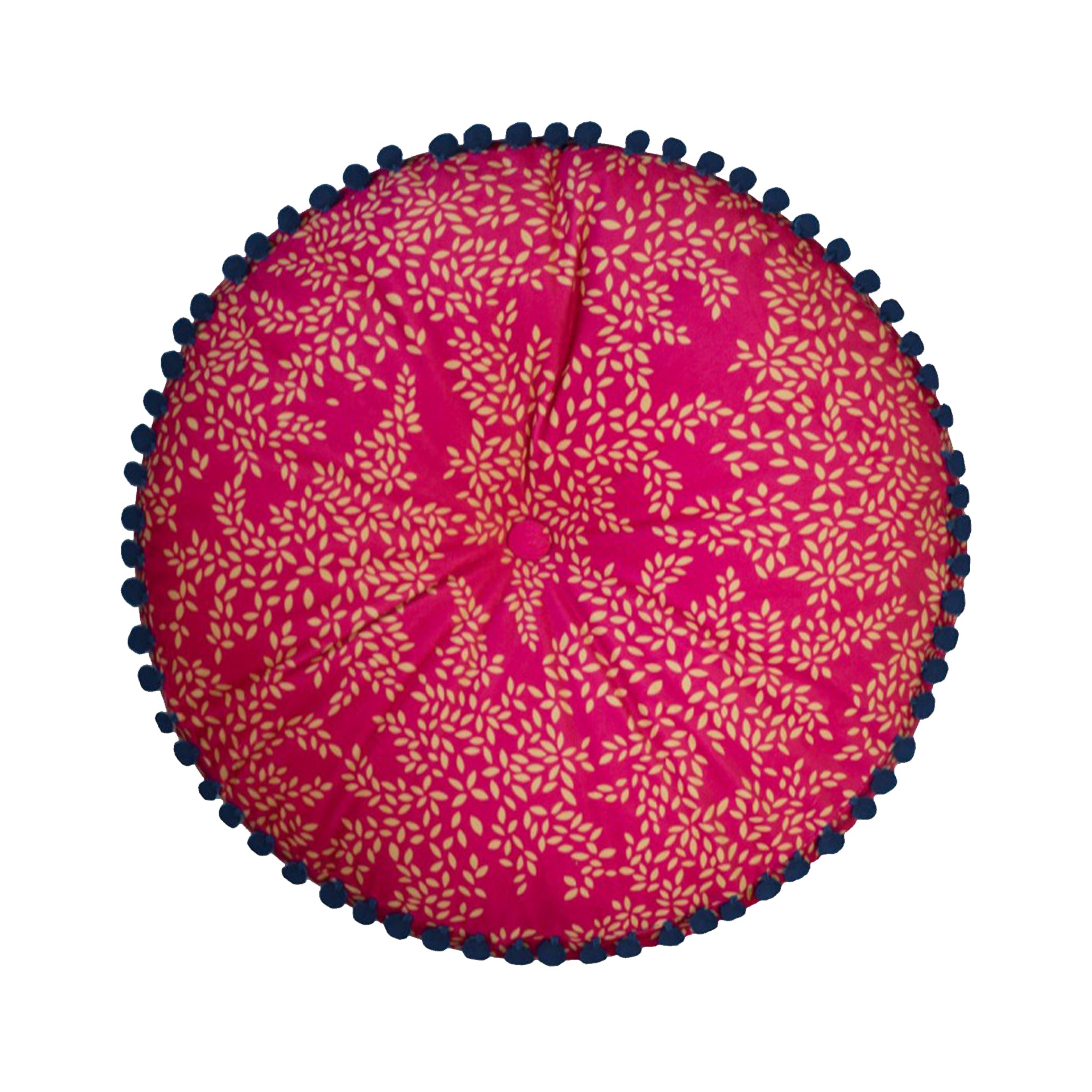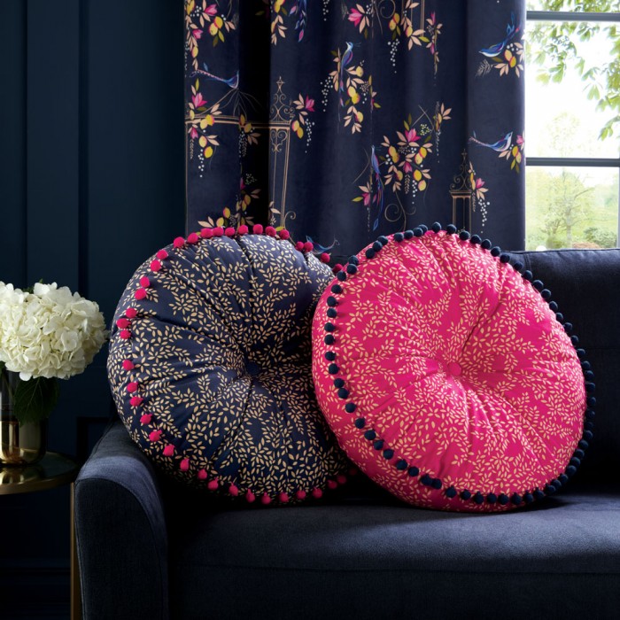 Make a statement with this opulently oversized velvet cushion in vibrant Fuchsia from Sara Miller London. Featuring the timeless Little Leaves print, this sumptuous round pink cushion with contrasting Navy pom-pom trim and central button detail, will create a stunning focal point. Or team-up with other cushions in the collection to create a luxurious, decadent look.